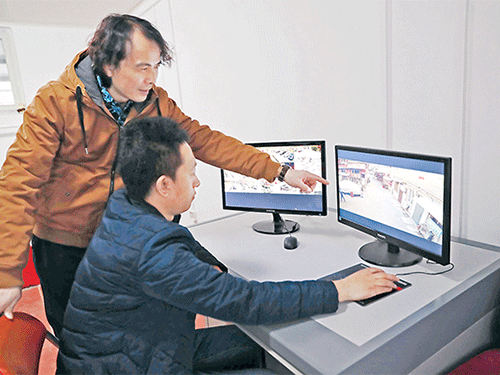 在左家庄街道顺源里小区的视频监控终端,工作人员只需轻点电脑鼠标,电视大小的高清屏幕上立刻就显示出不同点位的监控画面,不仅可以看到小区内部的监控画面,小区周边的景象也可以实时反馈到屏幕上。