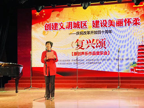 12月21日,以“创建文明城区、建设美丽怀柔”为主题的纪念怀柔区改革开放四十周年、大型原创作品演唱会在怀柔文化馆盛大开幕。此次活动由怀柔区文联联合区内多家单位共同主办。本次音乐会是怀柔改革开放,怀柔区音乐界展示的第一次原创作品成果,十首精心挑选出来的怀柔之歌,声声动听,曲曲精彩,赢得了现场观众的阵阵热烈掌声。