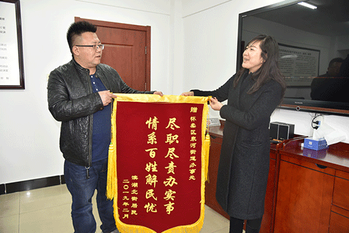 怀柔区泉河街道春节期间接到张女士来电反映下水管道堵塞,来电人表示自己找了维修公司,但未发现问题所在,没有办法的情况下拨打了市非紧急救助热线“12345”。值班人员王伟接到电话,立即联系维修公司人员并一同前往现场进行检查,经过半天时间也未找到问题所在。第二天,王伟同志委派维修人员进行大面积维修,把整个污水管道全部挖开,在主管道出来后加了个地井,便于以后维修。经过三天的维修问题得以解决。路面也恢复原状,场清地平。于2019年2月26日,张女士来到泉河街道办公室,为我们送上锦旗,感谢“12345”想百姓所想,为居民解忧。