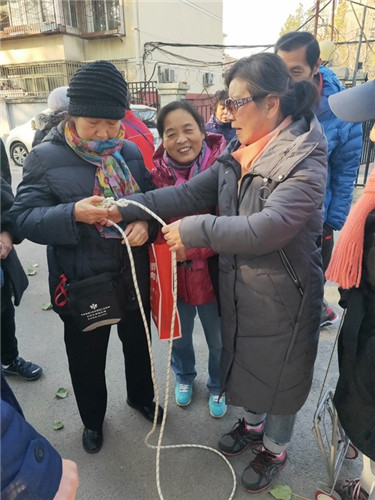 在给大家进行培训和示范之后,小区保安人员将油锅点燃,社区志愿者开始轮流使用灭火器进行灭火,现场利用灭火毯进行铺盖,消防员手把手教大家绳结的打法。