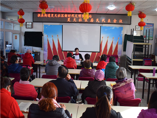 房山区拱辰街道昊天社区新时代文明实践站12月2日上午召开了全体居民代表大会,本次会议共有五项内容:社区书记安立霞和大家一起观看了宪法宣传片;然后带领大家学习了十九届四中全会的精神;对于现阶段防火重点时期,要求大家对消防安全引起重视,做好宣传工作;最后为了下一年度暨2020年更好更合理使用公益金开展社区活动会议,让大家一起讨论后,再用举手通过的形式进行对下一年度的每项活动公益金的使用分配金额进行表决。
