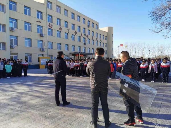 活动中派出所工作人员对全体师生进行了反恐防暴宣传教育演练,主要讲述了预防为主,快速反应的宗旨,并现场教学各种器械装备的使用方法。