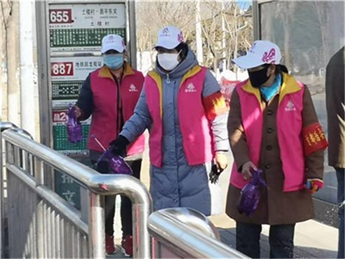 志愿者们每日对辖区公共区域全面开展卫生消毒工作。大街小巷、公交站、各家楼门、广场公共设施等都是消毒重点区域,奤夿屯村志愿者张晓翠说,“只有每天定期消毒,才能让老百姓放心”。