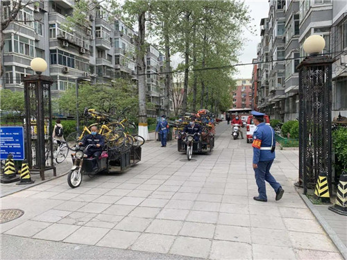 在防控疫情期间,为了让社区环境更加优美、有序。4月7日上午,学院路街道志新社区党委、居委会联合房修一物业公司,在志新北里小区开展废旧自行车清理活动。