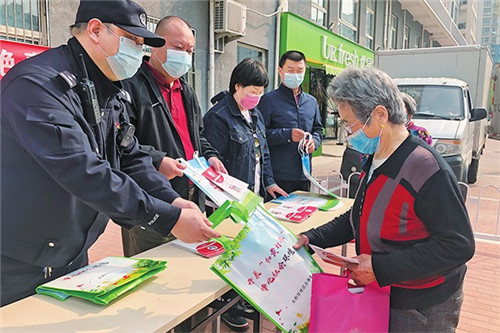 太阳宫地区开展4.15国家安全普法宣传活动,工作人员现场向居民发放国家安全相关的宣传资料。