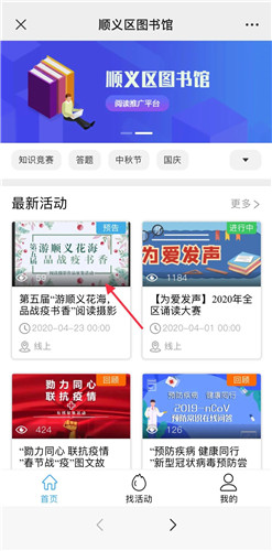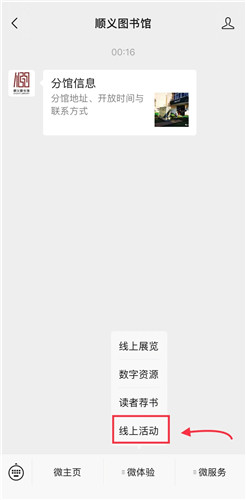 方式二:关注“顺义图书馆”微信公众号,点击“微体验——线上活动”,点击相关活动报名即可。