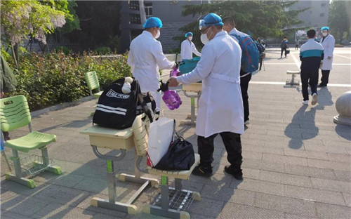 4月27日,北京师范大学良乡附属中学门口设置了醒目的黄色分流栅栏,分为“教师”“学生”“车辆”通道,高三学子陆续返校。学生们佩戴口罩,按照此前模拟演练过程,测温、消毒,走进校园。
