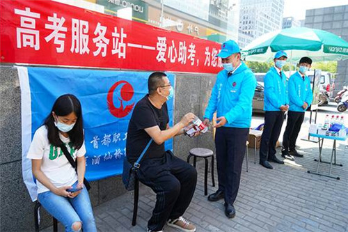 高考期间,东湖街道在北京第八十中学东门外南北两侧设置了爱心助考点,并通过“创享计划”链接爱心助考企业,为考生提供文具、湿巾、矿泉水、雨具等物品。今年的服务项目结合疫情防控,考场外不再设置等候区,改设“落客区”,志愿者们在这里引导开车送考的家长随停随走,提示在外等候的人员注意保持距离,避免扎堆。如果特殊情况考生需要联系家长,志愿者也提供应急电话。志愿者们用周到全面的服务,为高考生提供温馨的考试环境,也舒缓考生、家长的心理压力。