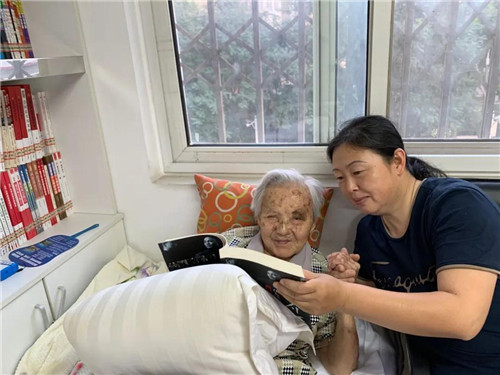 “小孟啊,您给我读读这段呗,我看不清。”李奶奶一手牵着孟宪凤的手,一手拿着一本《钟南山》听孟宪凤给她念。李奶奶爱看书、爱听新闻,但她视力不太好,孟宪凤、金秀丰便成了她的“有声电台”,每天为她读一些她感兴趣的书籍以及一些热点新闻内容。