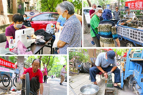 在管庄东里社区206号居民楼东侧空地上,一幅“幸福画卷”正缓缓展开。这里是社区社会组织“心桥服务沙龙”公益服务队的公益服务活动现场,有理发、修理自行车、磨刀、量血压、测血糖、缝补、垃圾分类知识宣讲等多个点位,免费为居民提供服务。