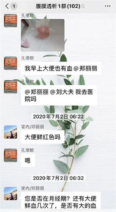 “我早上大便有血,用去医院吗?”7月2日早上六点多,腹膜透析患者孔女士在家中发现大便带有鲜血,随即拍下照片发送到患者微信群。