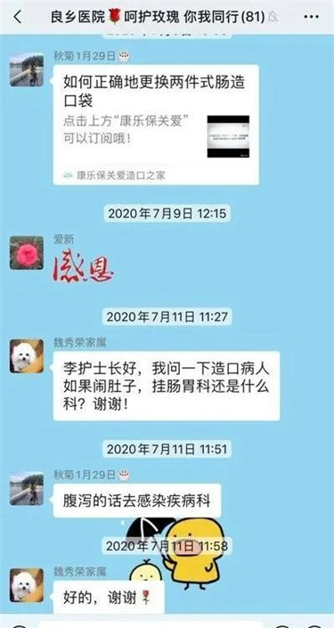 “造口人”作为社会上特殊的群体,需要家人的关爱,社会的帮助,更需要专业的康复指导。2017年房山区良乡医院开设造口护理门诊,专为造口患者提供造口日常管理及专业、全面、安全、便捷的护理服务,同时建立患者微信群,第一时间了解患者造口变化,及时有效地解决患者的问题。因新冠肺炎疫情原因,自2020年春节开始房山区良乡医院暂停造口护理门诊,停诊期间医护人员通过微信群对患者进行造口自我护理指导、转发造口护理相关宣教知识,并解答患者的各类问题。患者们在群里纷纷表示,有了这个微信群,感觉医护人员时刻在自己身边一样,保护着大家的安全,护航着大家的健康。