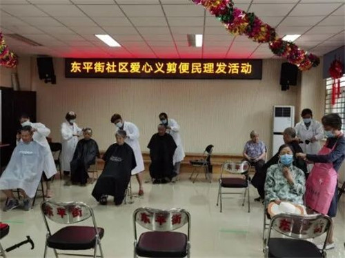 为了确保安全,理发地点设在居委会宽敞的多功能厅,确定人员安全距离并做好通风。在理发过程中,志愿者为了打消大家的顾虑,确保安全,佩戴口罩帮大家理发,并随时用酒精进行擦拭消毒。