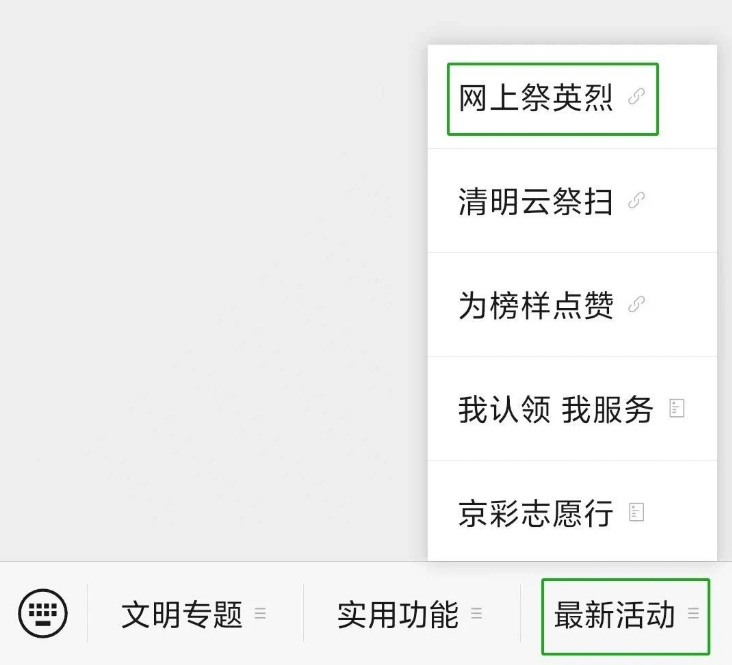 方式一:关注“文明北京”公众号,点击菜单栏“最新活动”,选择“网上祭英烈”按钮,参与活动。