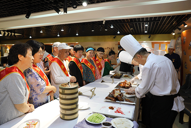 全聚德博物馆自2005年建馆以来,已成为展现老字号文化的重要窗口。北京榜样们漫步其间,不时在泛黄的账本、老式烤鸭工具前驻足。在非遗技艺大课堂环节,以2024北京榜样高朗为代表的团队现场演绎了“盛火烤鸭”“盛世牡丹”片鸭手法。只见厨师们手法娴熟、刀工细腻,一片片薄如蝉翼的鸭肉被精准片下——“盛火烤鸭”以火焰造型为灵感,鸭肉排列如跳动的火苗,色泽枣红透亮;“盛世牡丹”则将鸭肉片成层层叠叠的花瓣形状,宛如一朵绽放的牡丹。