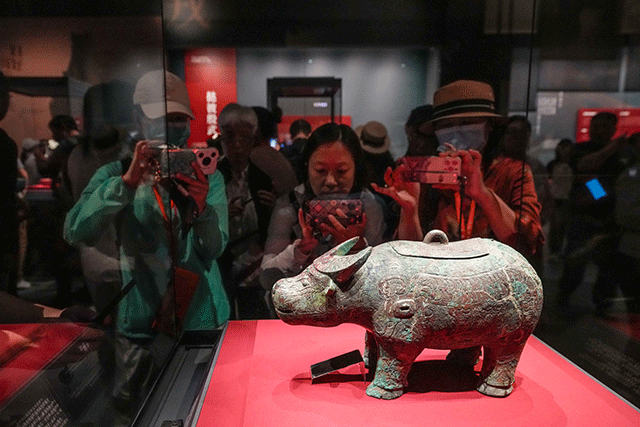 “限时出差”的文物牛尊,也备受关注。展柜前一直人头攒动。年过七旬的张先生举着手机,绕着展柜转了一圈,把文物前后左右各个角度都拍了个遍。