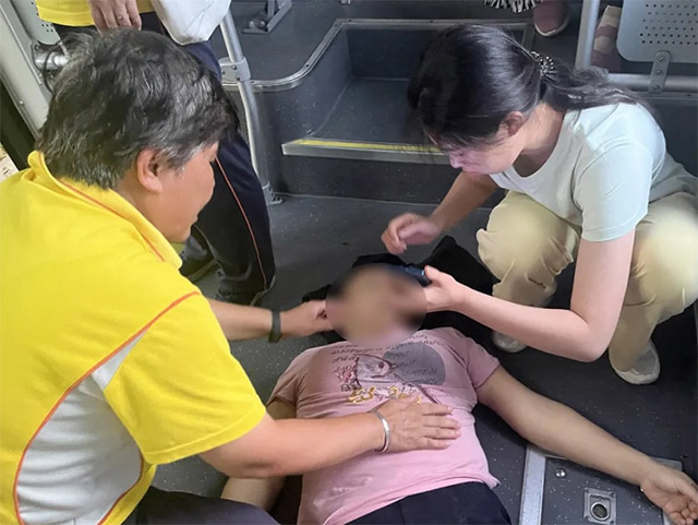 贾红梅(左)上前掐按乘客人中穴,帮助其恢复意识。