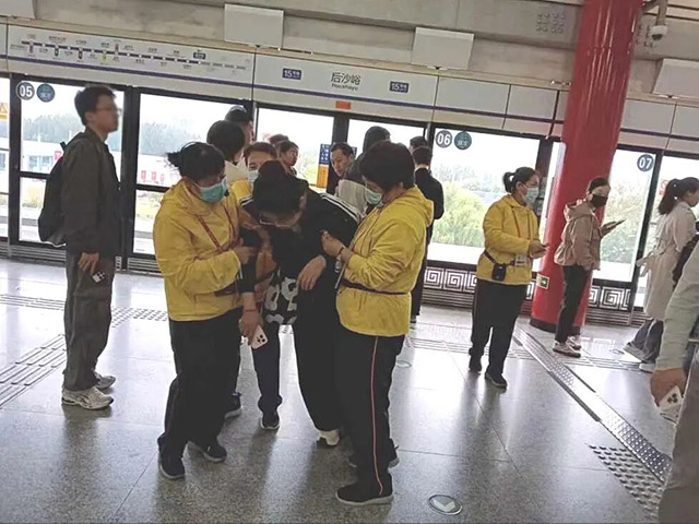 9月22日,在后沙峪地铁站,顺义区公共文明引导员杨增奇看见一位女乘客踉跄着出车厢时快要晕倒,立即上前支撑。队友刘新阳、王海英、张丽杰迅速赶来,合力将乘客扶至座椅休息,喂食糖果缓解症状,直至其身体恢复。