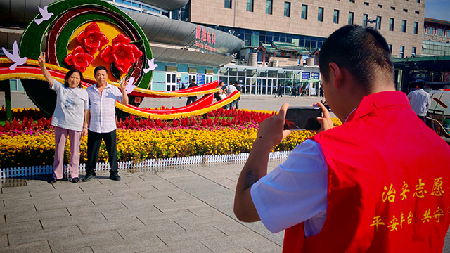 看到一对老年夫妇正在国庆主题花坛前互拍照片,来自中铁设计综合服务中心的志愿者王乾赶紧上前询问:“需要帮您二位拍一张合影吗?”对方立刻欣喜地回应:“正想找人帮忙呢,我们还有点不好意思开口,真是太好了。”横拍、竖拍,换个角度再拍两张,王乾贴心地为二人留下了开心的瞬间。接过手机后,夫妇俩连声向他道谢。