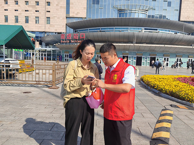 早上9时30分,志愿者们已摆好桌椅,在广场服务点上等待需要帮助的旅客。“我一出站就分不清方向了,要去长途汽车站该怎么走呀?”“我想去这个宾馆该往哪个方向走?”前来咨询的旅客络绎不绝,志愿者李燕等人耐心地为他们解答着。在引导完一批旅客后,志愿者们并未停歇,而是主动在广场巡视,继续寻找需要帮助的人。