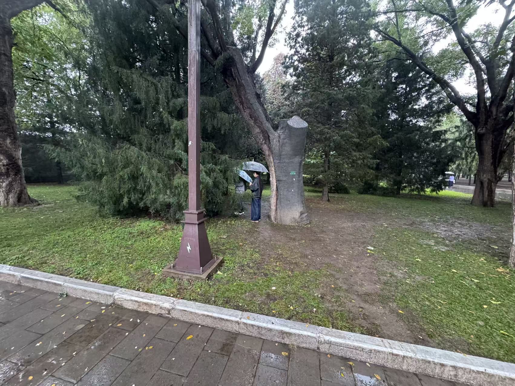 昨天,在地坛公园西南门附近的一棵松树旁,十几位游客冒雨排成一队,其中约三分之一的游客还拖着行李箱。这些游客逐个走进草坪,走到松树前蹲下与认养标识牌合影。松树周围的草坪已经斑秃,露出大片泥土。“我是提前做好攻略后,特意前来打卡的。”一位来自河北的女孩子表示,来之前没想到下雨天儿也会有这么多人来打卡,“前两天朋友来玩时,排队的有四十多人,她排了半个小时才打卡成功。”这名女孩子说。