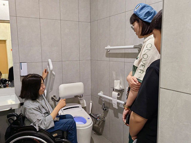 目标:东城区一栋办公楼里的无障碍卫生间;任务:给卫生间内无障碍设施找找茬、打打分;出行方案:从家出发,将电动牵引车头装在轮椅前,“骑”到地铁站再换乘地铁……