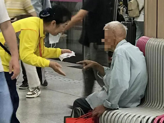 当日17时15分,公共文明引导员贺解荣在刘家窑站台接到乘客反映,发现一名老人倚靠柱旁、神情迷茫。贺解荣上前搀扶老人至座椅休息,耐心询问情况。由于老人持浓重扬州口音,沟通存在困难,仅能辨识“火车站”等关键词。经耐心引导,老人出示了身份证和一张从丰台站开往扬州的火车票,票面上留有一串联系电话。