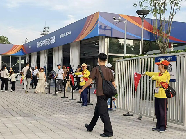 中国网球公开赛期间,朝阳区公共文明引导员在国家网球中心及周边区域提供服务。他们在观众出入口协助指引入场、解答票务咨询,并适时提示“有序排队”“保持安静”等观赛礼仪。同时,在地铁站与交通路口,文明引导员挥动引导旗维持人流与车流秩序,助力保障赛场周边交通顺畅。