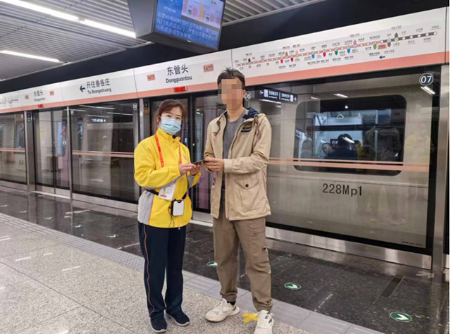 接听电话的是太平桥街道文明引导员曹凤英。她在上班途中发现座椅上有一部手机,当即高声询问周围乘客是否遗落。见无人应答,她便将手机妥善保管,并带往值守的东管头站静候失主联系。见赵先生打来电话,语气急促,十分心急,她连忙安慰道:“您别着急,我是文明引导员,我可以在地铁东管头站等您来取。”几分钟后,赵先生在东管头站见到了身着“柠檬黄”制服的曹凤英。