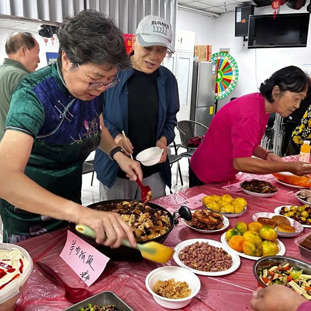 东高地街道的东高地社区新时代文明实践站内一场“中秋邻里合家欢”热闹开席。居民们带着自家烹制的拿手菜赶来,糖醋排骨、桂花糯米藕、菌菇鸡汤等三十余道家常美味,把四方餐桌摆得满满当当。大家围坐桌边,品佳肴、话家常,笑声此起彼伏,让中秋的“团圆”二字有了更真切的温度。