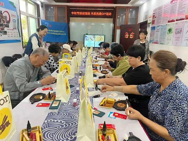 马家堡街道嘉园三里社区举办掐丝珐琅托盘制作活动,20余名居民在老师指导下体验这项国家级非遗技艺,用铜丝和彩砂创作出精美作品。