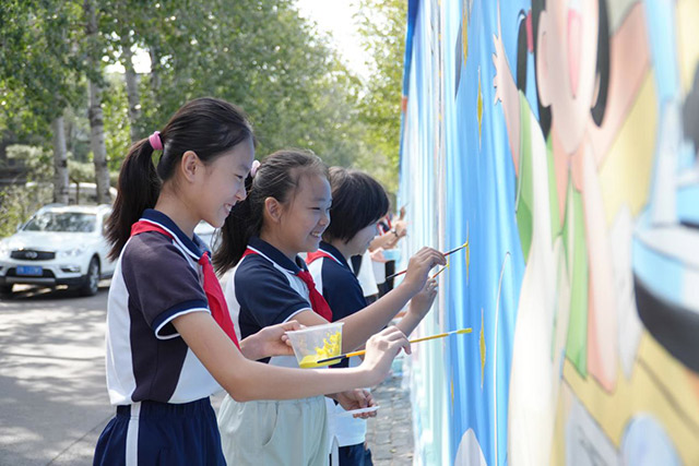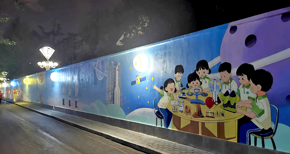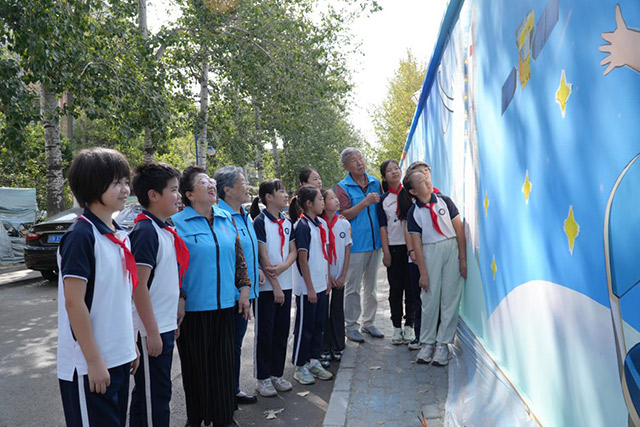 从火箭点火升空的震撼瞬间,到宇航员在“天宫课堂”进行科学实验,再到任务完成后的凯旋……这些中国航天事业发展历程中的重要场景复刻,引得来往于这条路上的行人、学子频频驻足。“我在电视上看到过这个!这是对接器,正在给卫星‘充电’呢。”一位五年级的学生指着墙绘兴奋地向同伴分享。