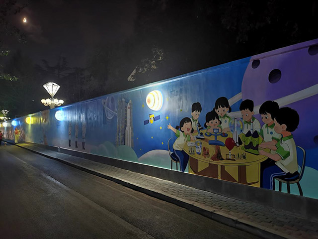 暮色降临,西侧墙面上的10个星球灯次第点亮,仔细看过去,四周还有点点“星光”作伴,太阳灯旁是“夸父一号”卫星、月球灯旁是“玉兔号”月球车、火星灯旁则是“祝融号”火星车。“晚上经过这儿,仿佛漫步‘星空走廊’,我们都很喜欢这面墙,既能学知识,又能照亮我们回家的路。”万源东里社区的李女士赞叹不已。据了解,制作团队在环保颜料中添加了特殊的荧光剂,使墙绘在白天色彩鲜艳,夜晚则呈现出星芒微亮的梦幻效果。