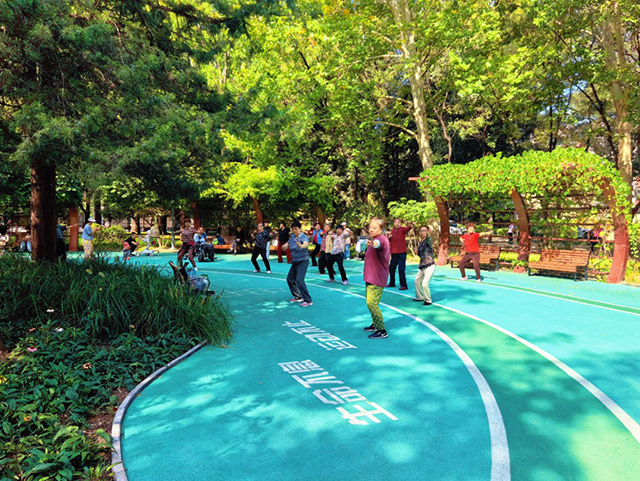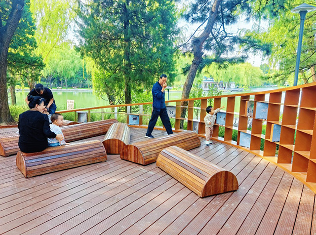 改造后,公园南北两岸增设了亲水平台和滨水栈道。坐在南岸亲水平台的圆凳上,湖光美景可尽收眼底。在环湖植被繁茂的区域,增设了森林探索区和自然趣径区。森林探索区巧妙利用原有坡地,添置了自然木质游戏设施,地面铺设的红蓝两色软质材料,为孩子们的安全保驾护航。自然趣径区结合地形打造了雨水花园与森林课堂,随处可见科普牌,为青少年提供了自然科普场所。