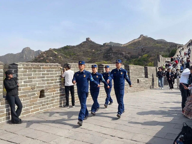 八达岭森林消防站的消防员们在长城上开展防火巡护。