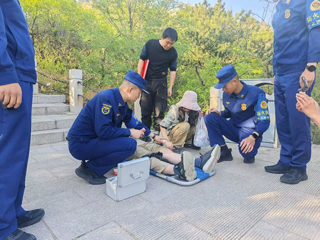 八达岭森林消防站的消防员们在救助突发疾病的游客。