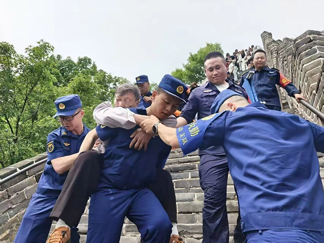 八达岭森林消防站的消防员背着突感不适的老年游客下长城。