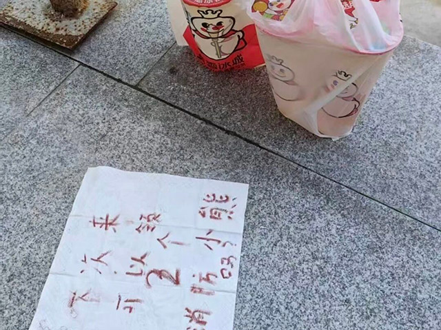 两位年轻姑娘在八达岭森林消防站营门口留下的奶茶和纸条。