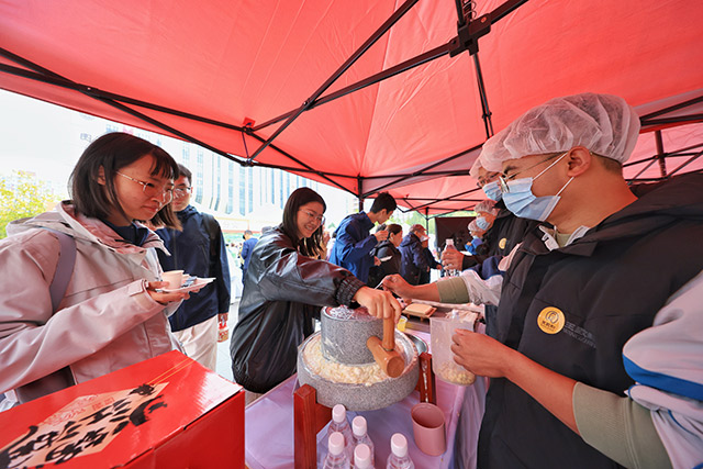 活动最热闹的环节当属非遗体验。王致和非遗传承人与研发人员来到现场,向师生展示腐乳的传统制作工艺。在传承人的指导下,师生们亲手参与磨浆、点卤制坯、搓毛、灌汤等制作工序,亲身感受非遗技艺的魅力。生物学院一位老师体验后说:“从大豆到腐乳的发酵过程蕴含深厚的微生物学知识,这既是一堂非遗传承课,也是一次生动的专业实践。”