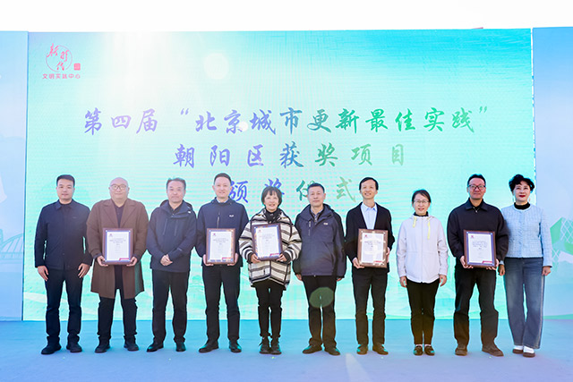 活动现场为在第四届“北京城市更新最佳实践”“优秀项目”中获得“北京城市更新最佳实践”的三里屯国际商居融合片区式更新(一期)、酒仙桥将台片区活力焕新两个项目颁发奖牌。