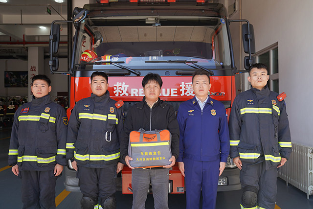 10月21日上午,在消防救援人员的邀请下,吴伟来到了黄村消防救援站,与消防救援人员合影留念,并收到了一份消防安全“大礼包”——车载应急包,里面有灭火器、充气筒和手电筒等工具。