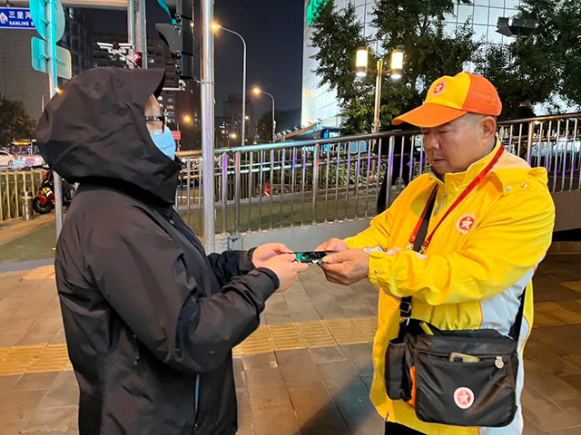 10月10日下午,南礼士路路口服务的公共文明引导员捡到一部手机后,不断询问过往行人。五分钟后,一位焦急的市民前来认领,经核实正是失主本人,手机也立即物归原主。
