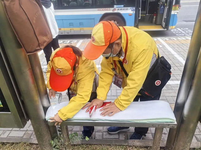 东城区交道口大街沿线多个站台,引导员们为座椅绑上了柔软防雨的垫子,并用胶条仔细固定,既整洁又牢固。