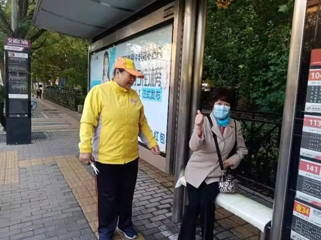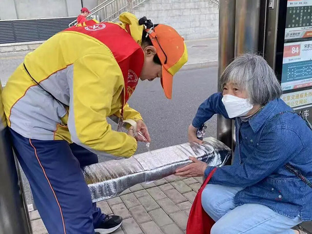 法华寺北行站的引导员们别出心裁,将积攒的快递保温袋裁剪成坐垫,这一环保又暖心的举动,也吸引了热心乘客一同参与。