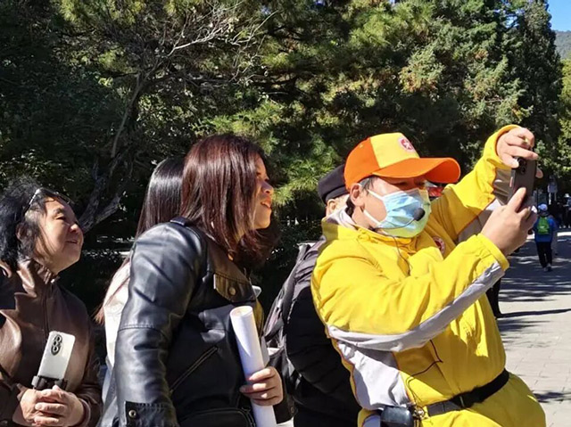 像这样的暖心场景时有发生。一名下山游客不慎摔倒,膝盖破皮,引导员立即携带急救包上前,为其消毒包扎。巧合的是,这位游客本人就是医生,对引导员的专业应急处理连连称赞。见到想拍集体照的四川老年团,引导员帮忙找角度、录视频,收获一片“巴适得很”的称赞。这些点滴细节,让天南地北的游客真切感受到了北京的温度。