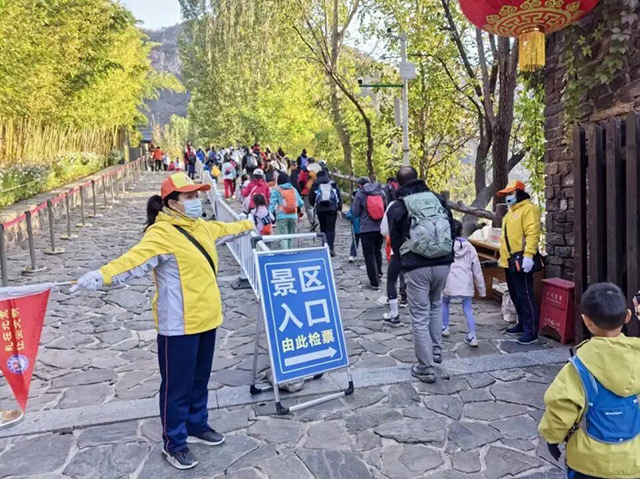 “请将车辆停放在指定停车场,乘坐免费摆渡车进入景区。”在坡峰岭停车场,引导员们有序指挥着往来车辆。他们还在山路险要处值守,及时提醒游客注意脚下安全,并主动为游客指引进出路线。
