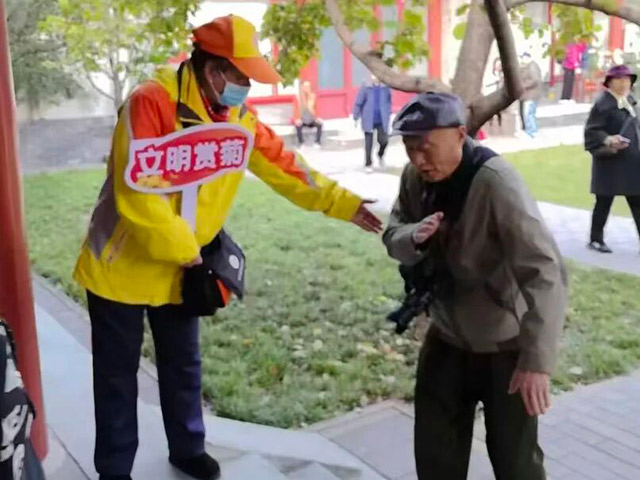 引导员们还积极开展文明劝导,协助保护园区环境,及时提醒游客“请勿触摸菊花”,并劝阻个别践踏草坪的行为。服务过程中,他们多次捡起地面遗落的纸屑、包装袋等零星垃圾,共同维护整洁的游园环境。