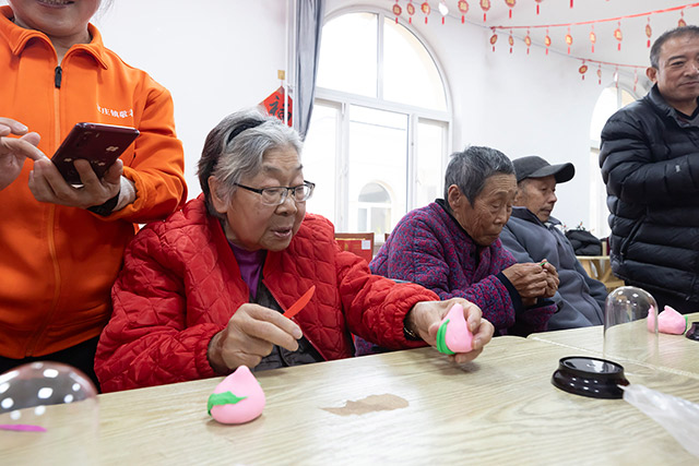 现场,通州区文旅局相关负责人也为敬老院的老人们赠送了非遗花馍,并送上节日祝福。演出活动后,老人们还亲自上手体验非遗面塑,跟着非遗传承人王学文捏寿桃。