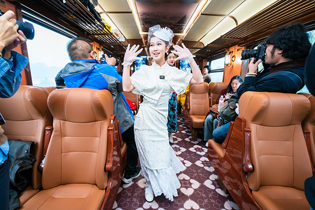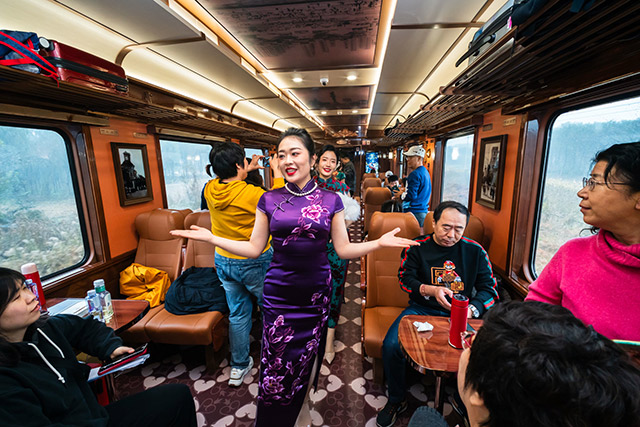 列车上,10节主题鲜明的特色车厢各具特色,旅客仿佛置身一场流动的舞台剧——每一节车厢,都是一个待解锁的故事场景。6节复古客座车厢化身“流动舞台”,以巡游式特色表演打破观演界限,让艺术与旅途无缝交融;1节蒙太奇幻境互动演艺车厢聚焦“游客共创”,通过剧情参与式体验,让每位乘客都成为故事主角;1节珍奇花园俱乐部车厢融合潮流文创与非遗传习,打造可看、可玩、可带走的非遗活化场景;1节沉浸式时空穿梭机车厢以科技赋能历史,用震撼体验带游客“穿越”千年津沽岁月;1节专属VIP车厢为商务客群提供私密舒适的专属空间,兼顾品质服务与文化体验。