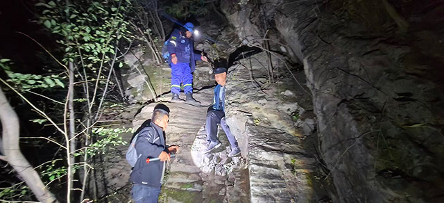 搜救途中,蓝天救援队员在山谷里不断呼喊两名女子的名字,终于在一处山顶看到对面山峰有微弱亮光,后来证实那就是被困女子的手机灯光。隔着一条峡谷,加之山谷里有回声,队员们历经两小时才最终判定两名女子的准确位置。